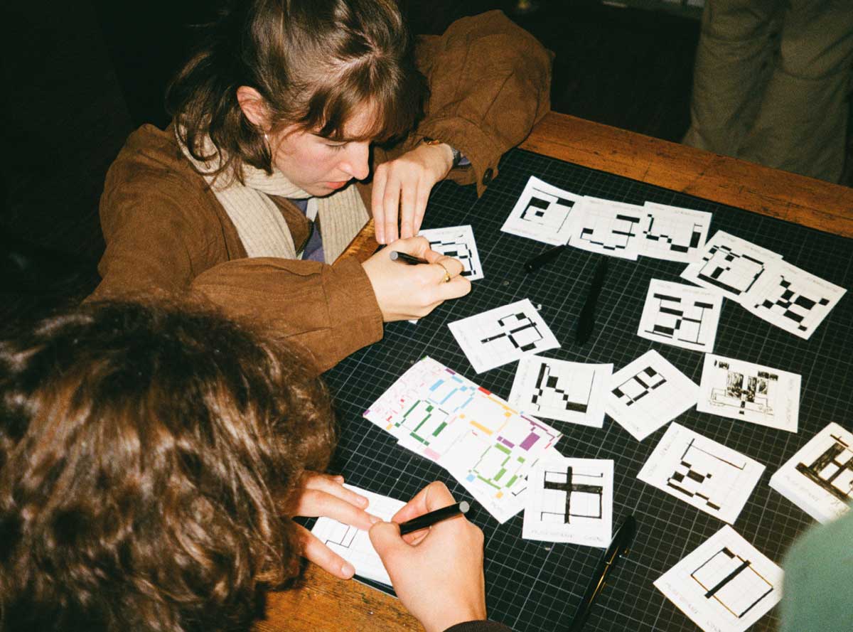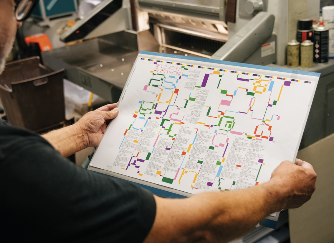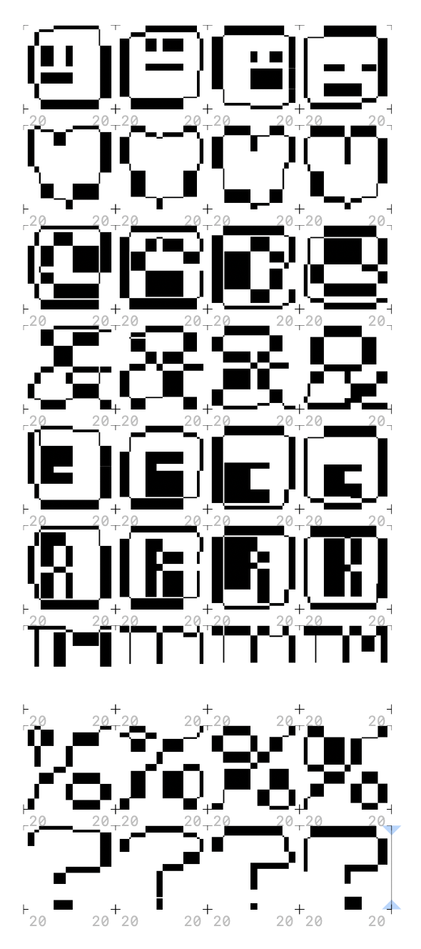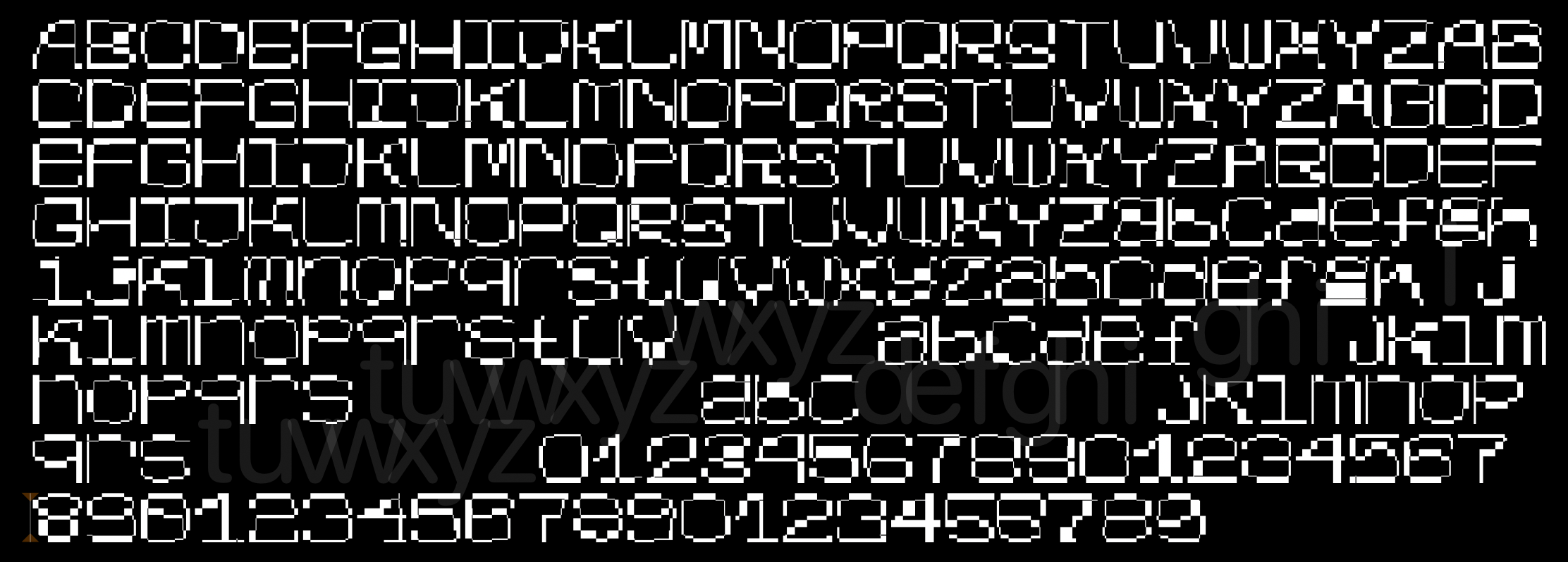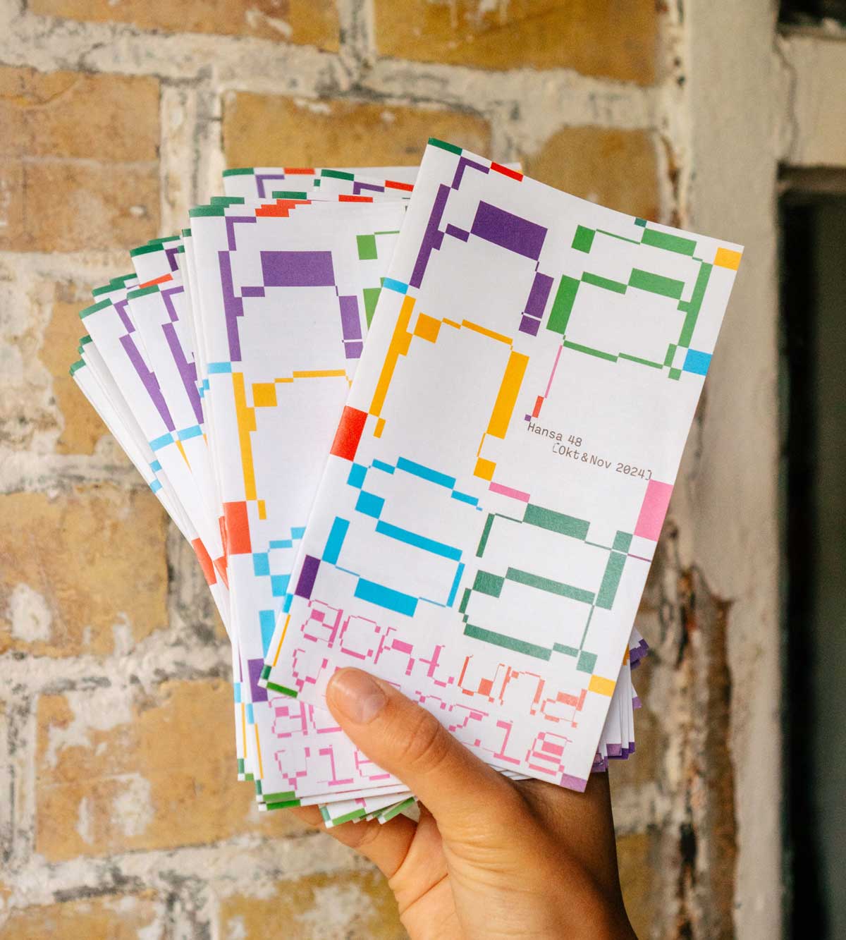 AusRaster – die Schrift mit Umdrehung basiert auf einem Raster, das für jede Buchstabenvariante um 90 Grad gedreht wird. Jeder Buchstabe besitzt vier verschiedene Varianten. Insgesamt umfasst das Set um die 500 Glyphen. Damit jeder Buchstabe natürlich ins Schriftbild einfließt, rotieren die Varianten zufällig beim Schreiben durch. Gestaltet wurde die Ausraster für ein Programmheft der Hansa 48, wo Sie Anwendung findet.